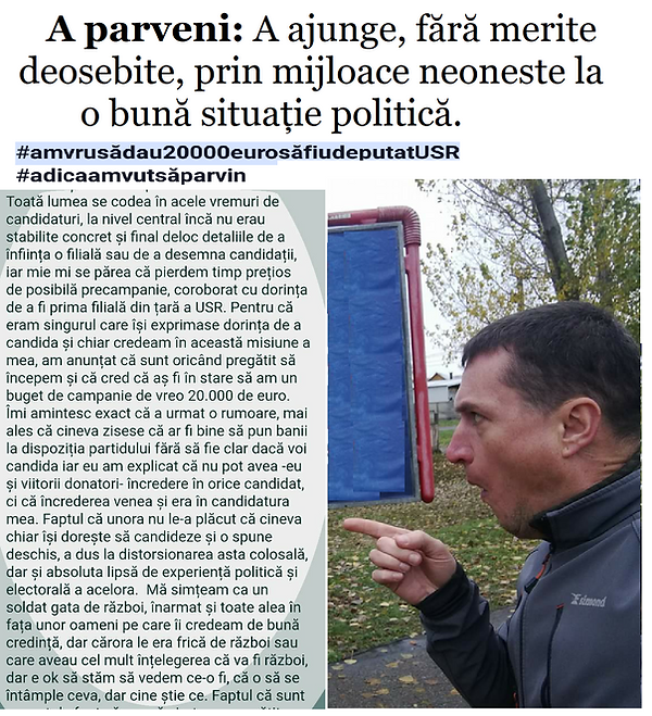 Si când i s-a spus să pună banii la dispoziția partidului s-a ofensat susținând că el și viitorii donatori nu au încredere într-un alt candidat ! Oare nu un parvenit se folosește de o formațiune ca și vehicul, si care se debarasează de cei care au muncit și au crezut într-o construcție.